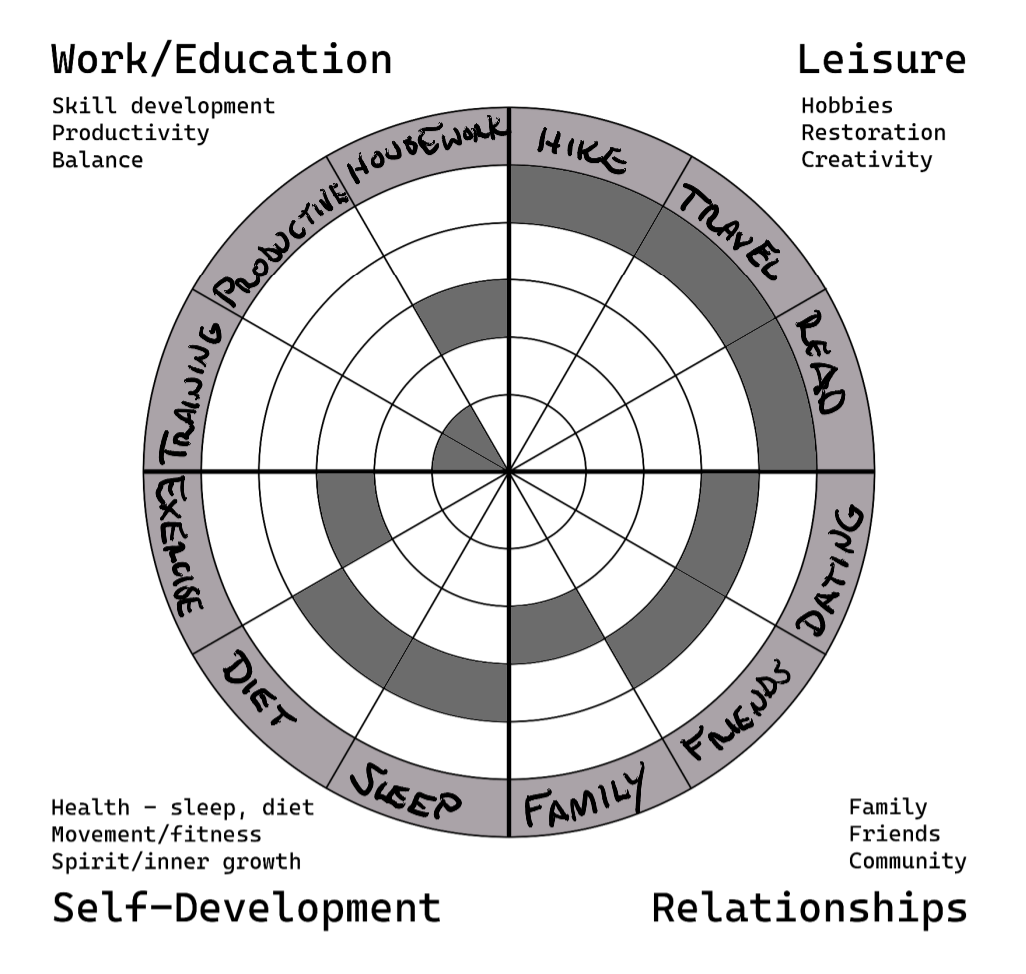 For example, you might have a section for Family and one for Friends in the Relationship domain. If you have strong family ties but lack a friend group, you might be closer to the center for Family but in one of the outer rings for Friends.